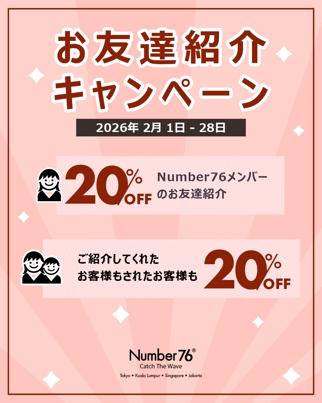 2月は、お友達ご紹介でお互い20%OFF!! ご紹介者(サロンメンバー)、ご紹介されたNumber76Tokyoに初めてご来店されるお友達、共に20%OFFになります!! 是非、この機会をご利用ください。 ※ご注意:紹介